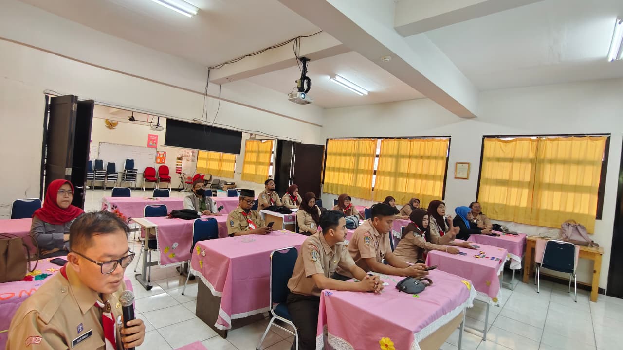 Suasana rapat terlihat tertib dan penuh kekompakan. Dalam foto bersama, seluruh pengurus tampak berdiri rapi mengenakan seragam cokelat dengan atribut organisasi, mencerminkan kebersamaan dan kesiapan menjalankan amanah. Sementara dalam dokumentasi jalannya rapat, para pengurus duduk berhadapan di meja-meja yang tertata rapi dengan taplak merah muda, menyimak pemaparan materi melalui layar proyektor dan televisi. Diskusi berlangsung aktif namun tetap kondusif, menunjukkan komitmen bersama dalam memajukan organisasi.